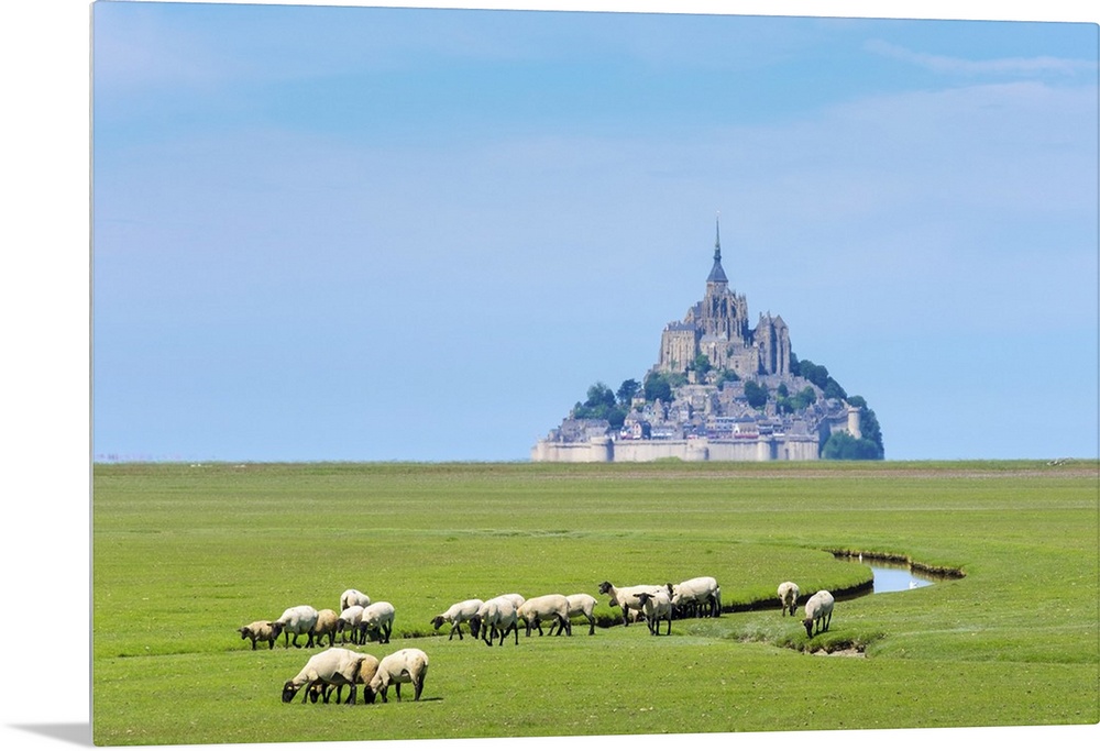 <p>France, Normandy (Normandie), Manche department, sheep grazing in front of Le Mont-Saint-Miichel.</p>