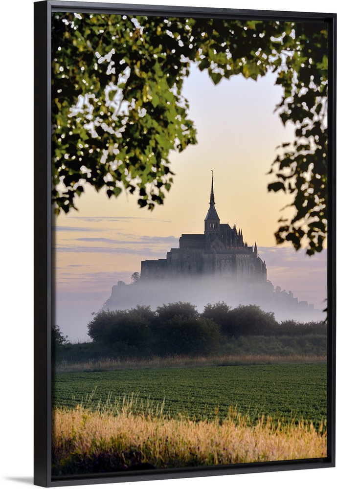<p>France, Normandy, Mont Saint-Michel, Atlantic ocean, Basse-Normandie, Le Mont-Saint-Michel at dawn appears in the fog.</p>