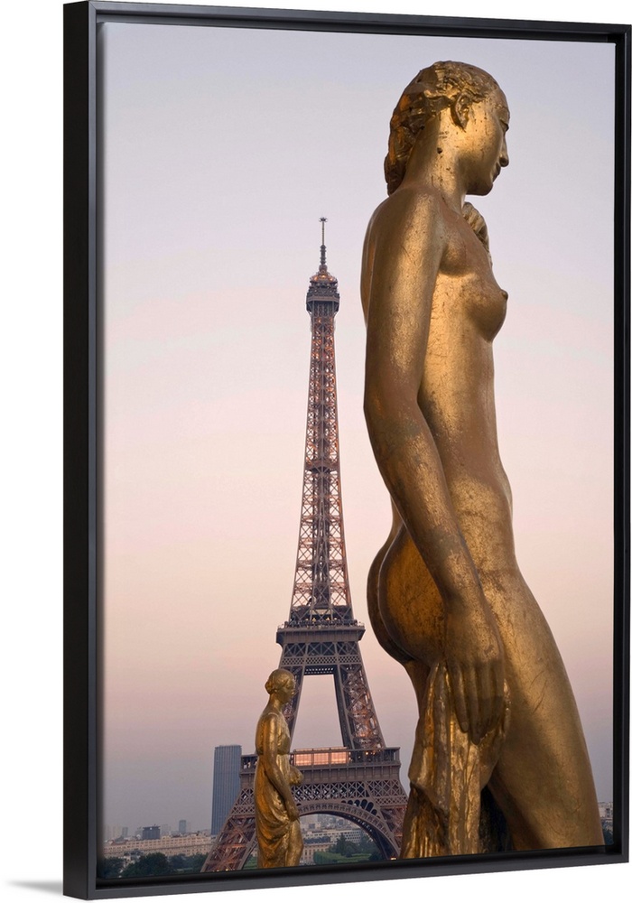 <p>France, Ile-de-France, Paris, Gilded statue at Palais de Chaillot and Eiffel Tower</p>