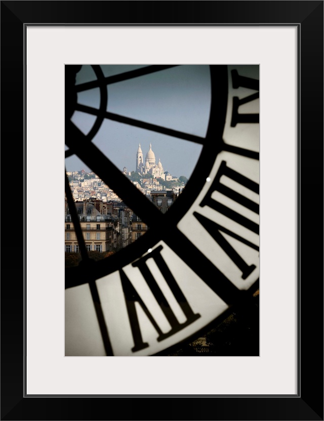 <p>France, Ile-de-France, Paris, Eiffel Tower, Invalides, Musee d'Orsay, The Basilique du Sacre Coeur through the clock of the museum.</p>