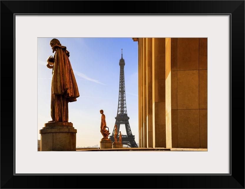 <p>France, Ile-de-France, Ville de Paris, Paris, Invalides, Eiffel Tower, Palais de Chaillot statue on Trocadero near the Eiffel tower</p>