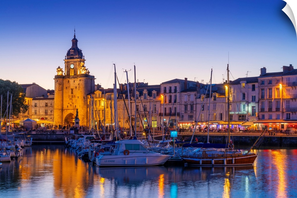 <p>France, Poitou Charentes, La Rochelle, Old Harbour, Porte de La Grosse Horloge at dusk.</p>