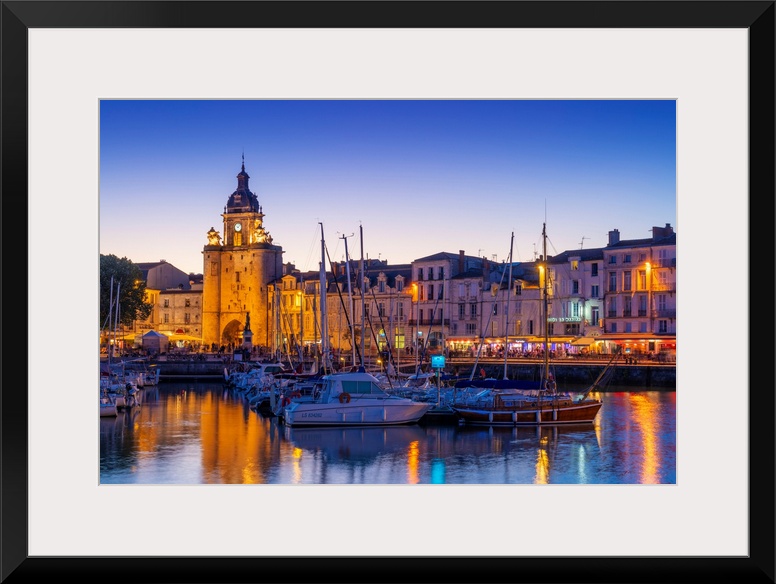 <p>France, Poitou Charentes, La Rochelle, Old Harbour, Porte de La Grosse Horloge at dusk.</p>