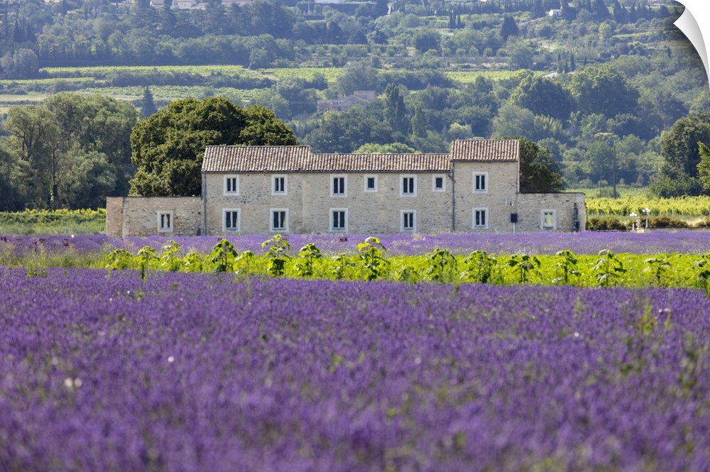 <p>France, Provence-Alpes-Cote d'Azur, Bonnieux, a traditional stone building surrounded by lavender and sunflowers near the village of Bonnieux</p>