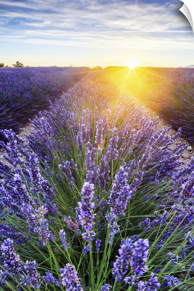 <p>France, Provence-Alpes-Cote d'Azur, Provence, Valensole, Lavender field at sunset, near Valensole</p>