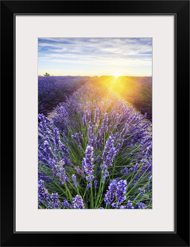 <p>France, Provence-Alpes-Cote d'Azur, Provence, Valensole, Lavender field at sunset, near Valensole</p>