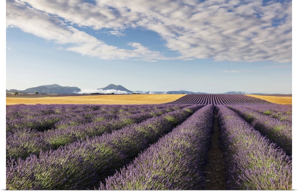 <p>France, Provence Alps Cote d'Azur, Haute Provence, Valensole plateau, rows of lavender and a field of wheat</p>