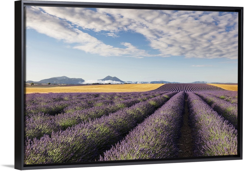 <p>France, Provence Alps Cote d'Azur, Haute Provence, Valensole plateau, rows of lavender and a field of wheat</p>