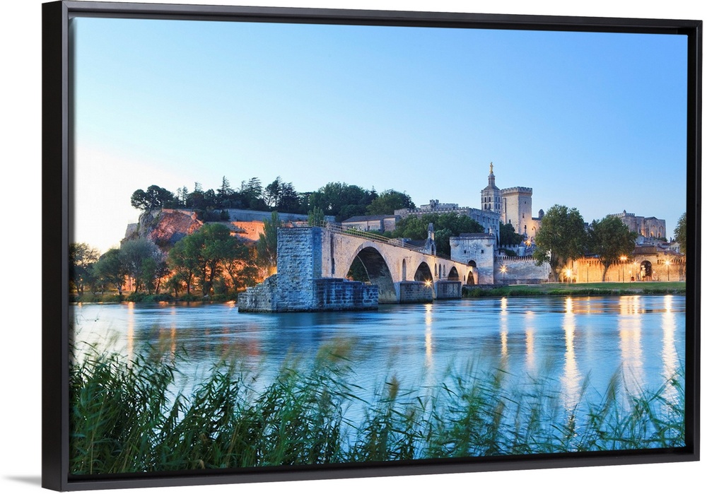 <p>France, Provence, Avignon, The old Pont Sant Benezet on the Rhone river with Pope Palace (Palais des Papes) in the back.</p>