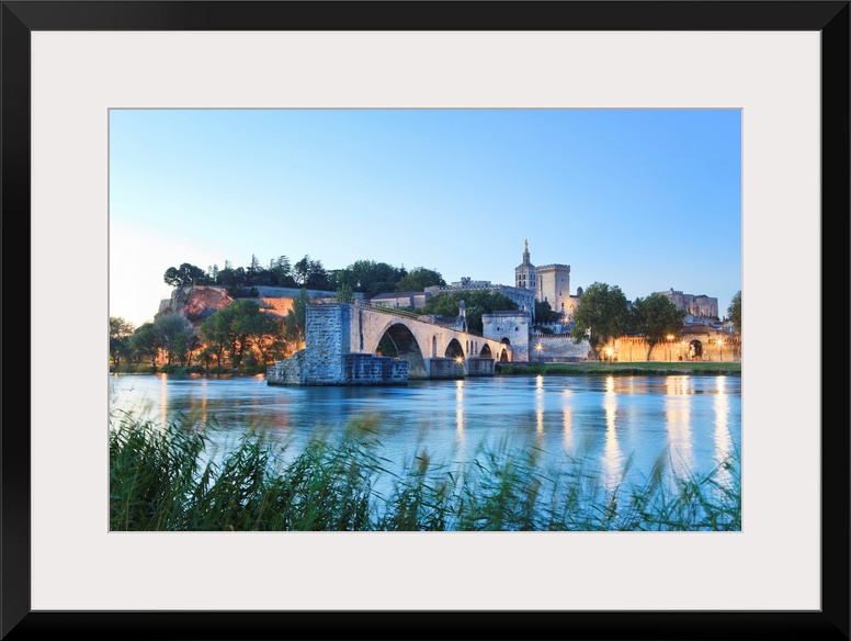 <p>France, Provence, Avignon, The old Pont Sant Benezet on the Rhone river with Pope Palace (Palais des Papes) in the back.</p>