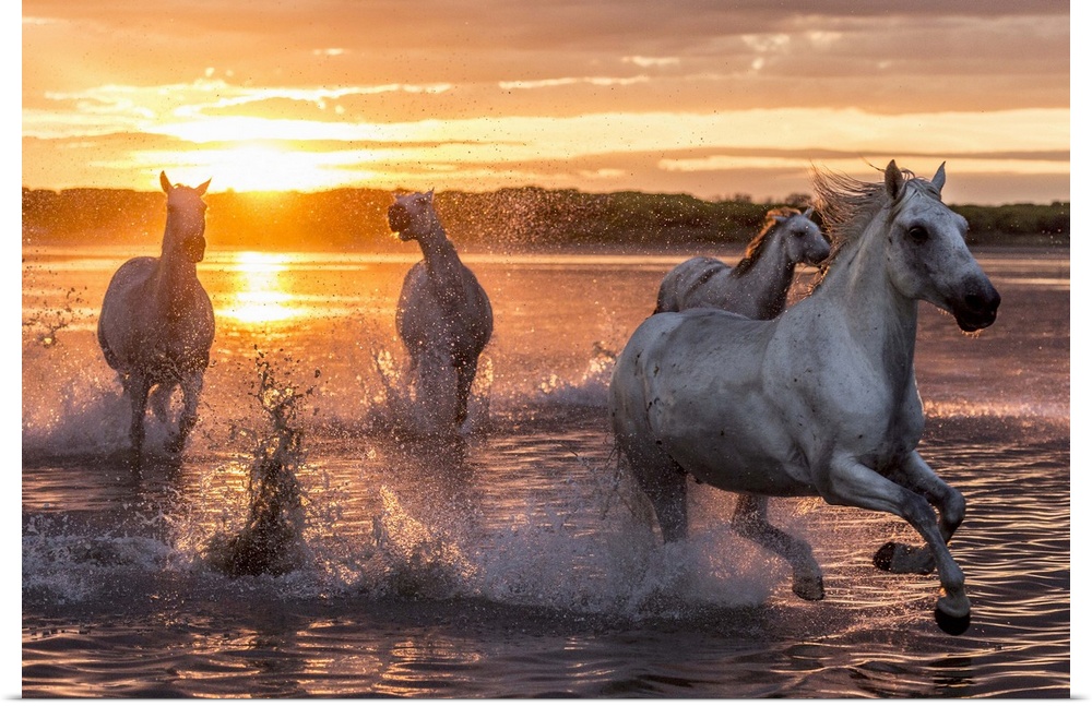 <p>France, Provence-Alpes-Cote d'Azur, Provence, Camargue, Bouches-du-Rhone, Regional Nature Park of the Camargue, Saintes-Maries-de-la-Mer, Camargue horses at sunset.</p>
