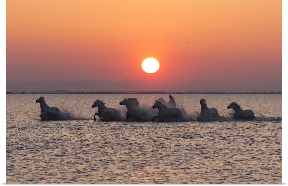 <p>France, Provence, Camargue, A herd of white horses gallop through a lake in the Camargue at sunrise.</p>