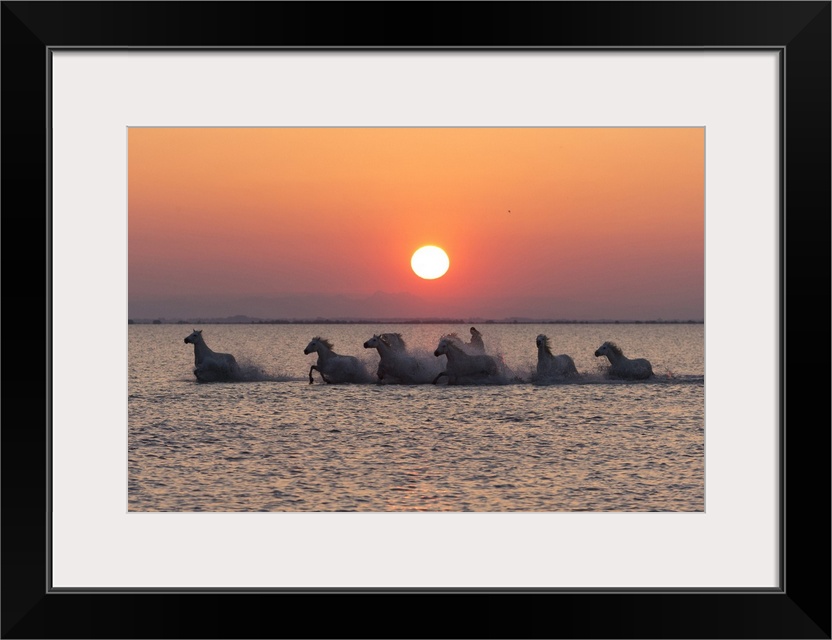 <p>France, Provence, Camargue, A herd of white horses gallop through a lake in the Camargue at sunrise.</p>