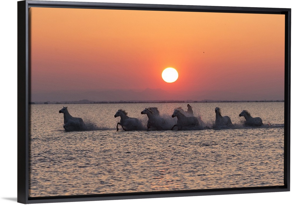 <p>France, Provence, Camargue, A herd of white horses gallop through a lake in the Camargue at sunrise.</p>