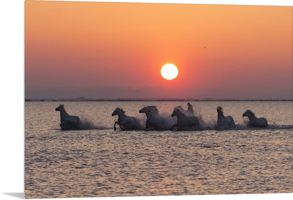 <p>France, Provence, Camargue, A herd of white horses gallop through a lake in the Camargue at sunrise.</p>