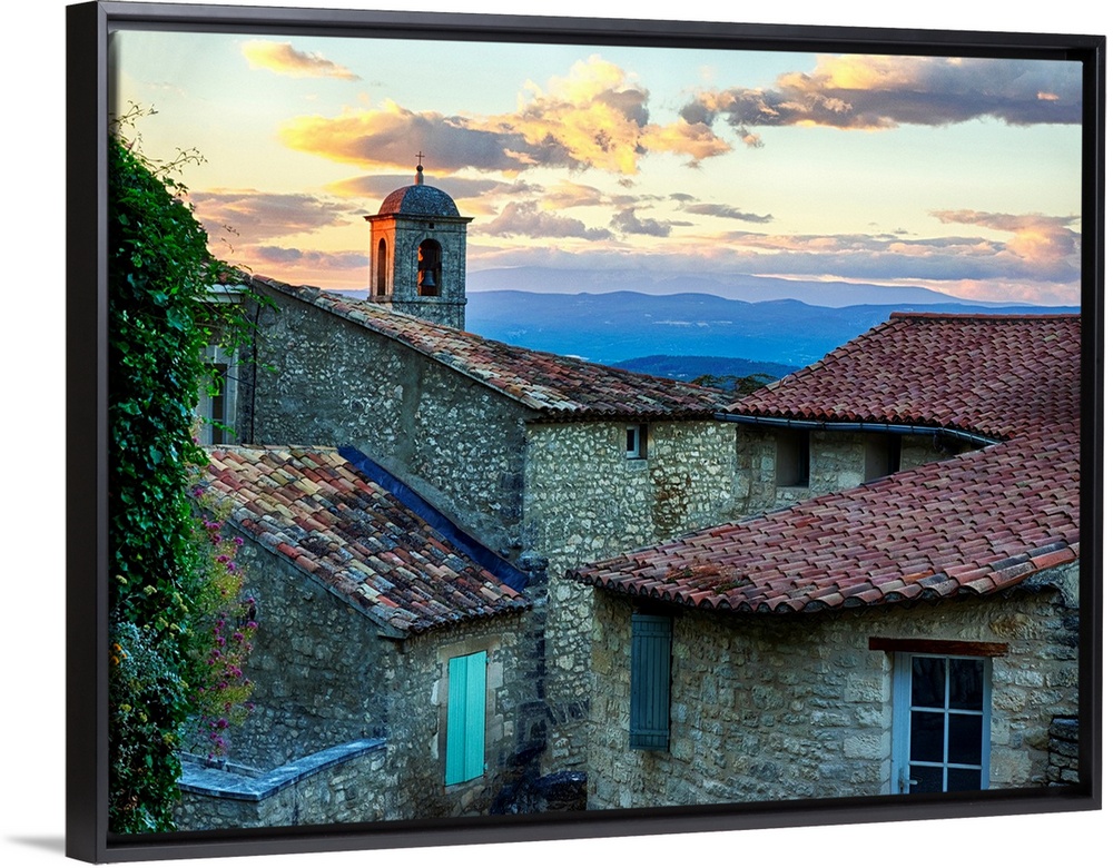 <p>France, Provence, Lacoste, Church Bell Tower and City at Sunset.</p>