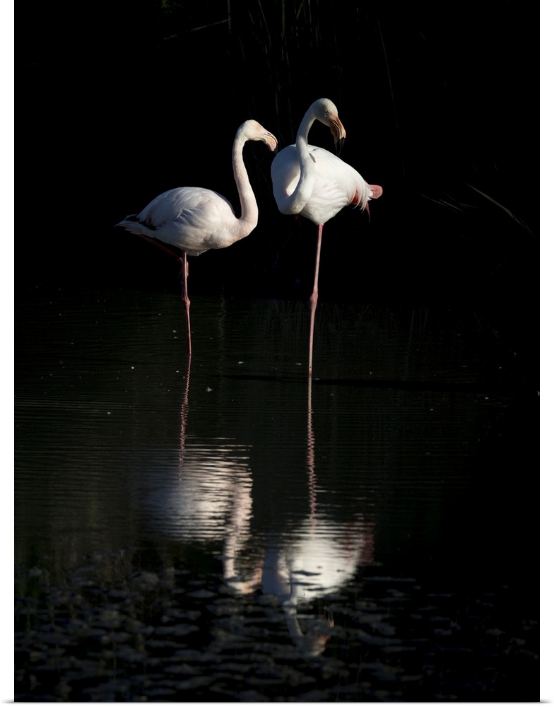 <p>France, Saintes-Maries-de-la-Mer, Regional Nature Park of the Camargue, A pair of flamingos rest at sunset</p>