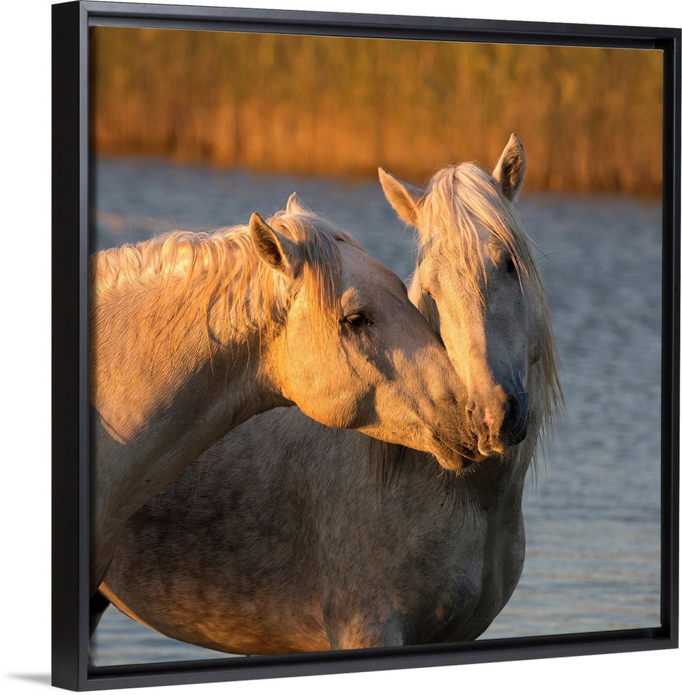 <p>France, Provence-Alpes-Cote d'Azur, Saintes-Maries-de-la-Mer, Regional Nature Park of the Camargue, Two white horses get close in the water.</p>