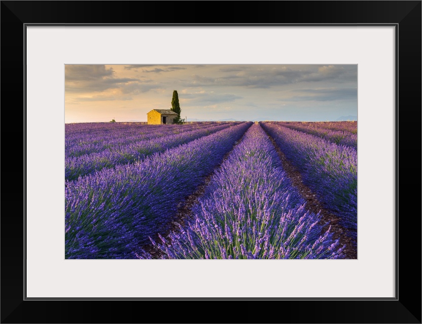 <p>France, Provence-Alpes-Cote d'Azur, Valensole, Provence, Vaucluse, Alpes-de-Haute-Provence, House with cypress in lavender field (Lavendula augustifolia), Plateau de Valensole.</p>