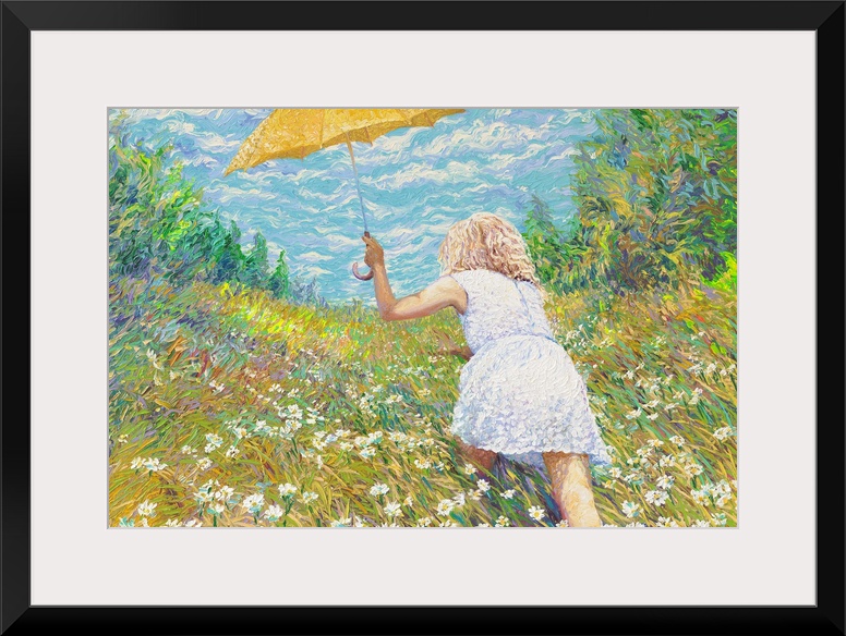 <p>Brightly colored contemporary artwork of a woman in white in a field of flowers.</p>