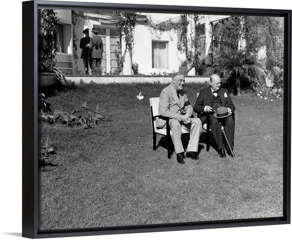 <p>President Franklin D. Roosevelt of the United States and Prime Minister Winston Churchill of Great Britain (right) photographed onthe lawn of the Hotel Anfa in Casablanca, Morocco, during the Casablanca Conference, January 1943.</p>