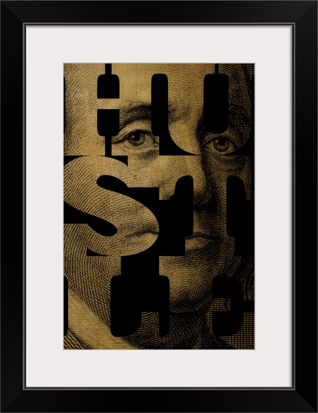 <p>Benjamin Franklin from the one hundred dollar bill coming through the word "HUSTLE," outlined in black.</p>