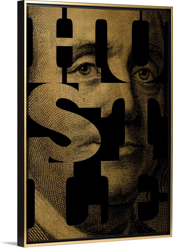 <p>Benjamin Franklin from the one hundred dollar bill coming through the word "HUSTLE," outlined in black.</p>