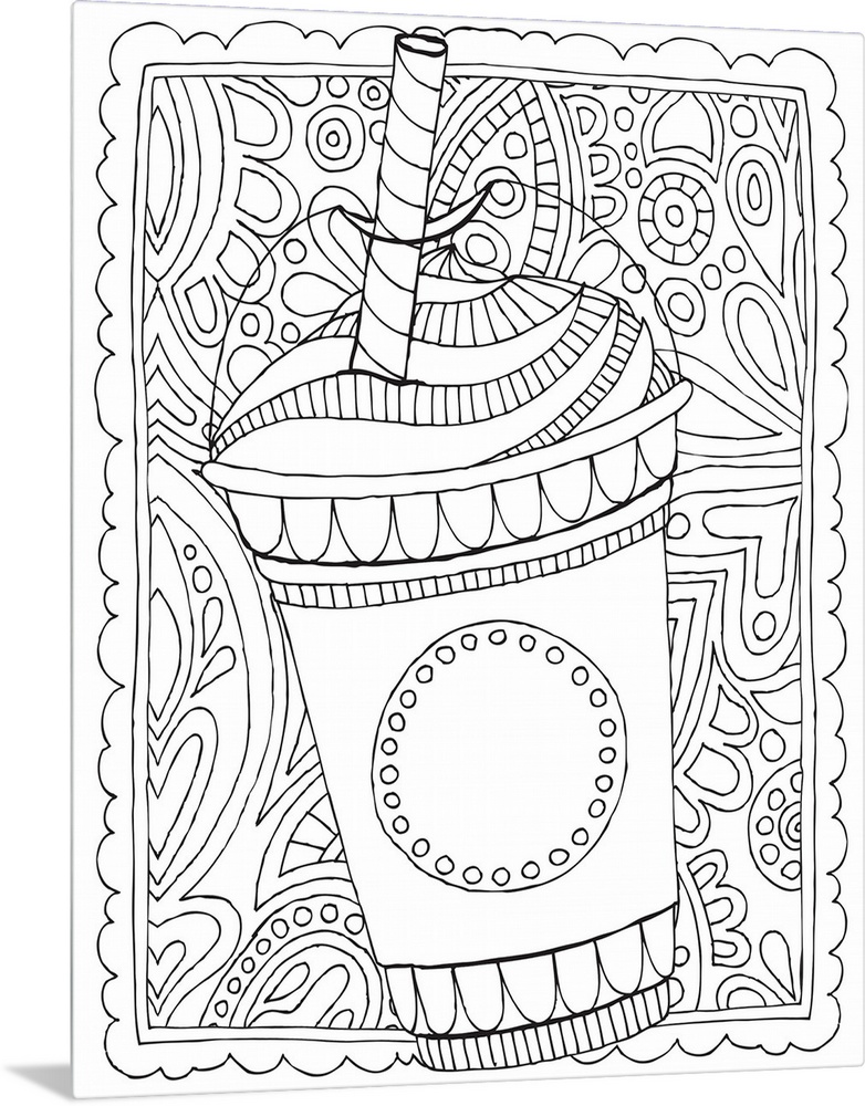 <p>Black and white line art of a frappuccino with a striped straw on an intricately designed background.</p>