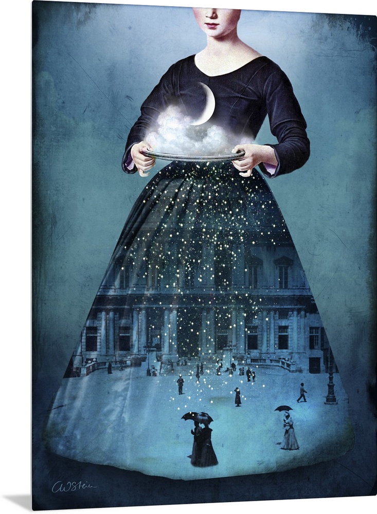 <p>A woman is holding a plate containing the moon and clouds, while a city street scene is shown on the skirt of her dress.</p>