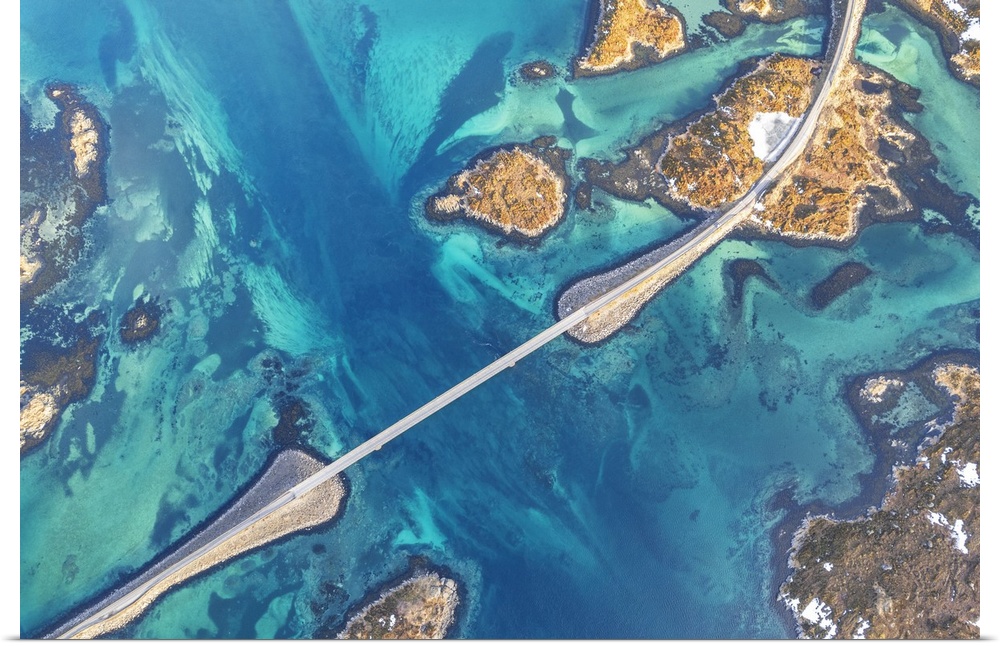<p>Overhead aerial view of Fredvang bridge crossing emerald waters of the fjord, Lofoten Islands, Norway, Scandinavia, Europe</p>
