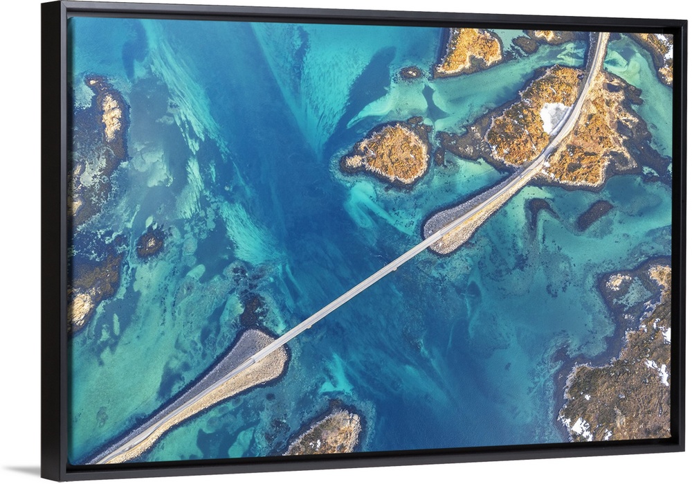 <p>Overhead aerial view of Fredvang bridge crossing emerald waters of the fjord, Lofoten Islands, Norway, Scandinavia, Europe</p>