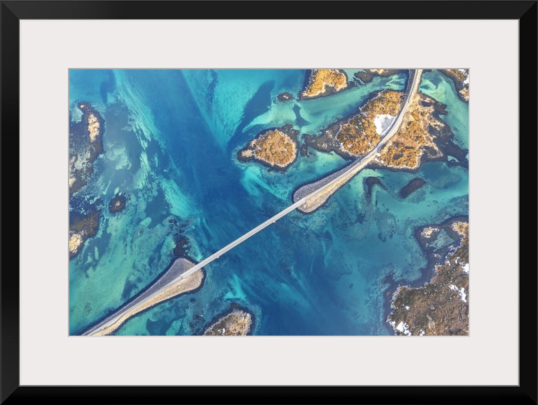 <p>Overhead aerial view of Fredvang bridge crossing emerald waters of the fjord, Lofoten Islands, Norway, Scandinavia, Europe</p>