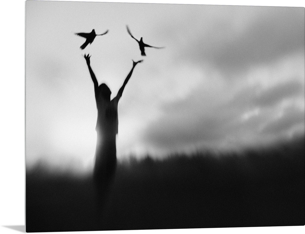 <p>A silhouetted figure releasing two pigeons into the air, Java, Indonesia.</p>