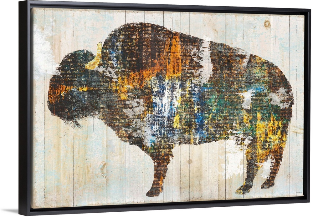 <p>Image of a bison made of multi-color textures with text peeping through, on a wood plank backdrop.</p>