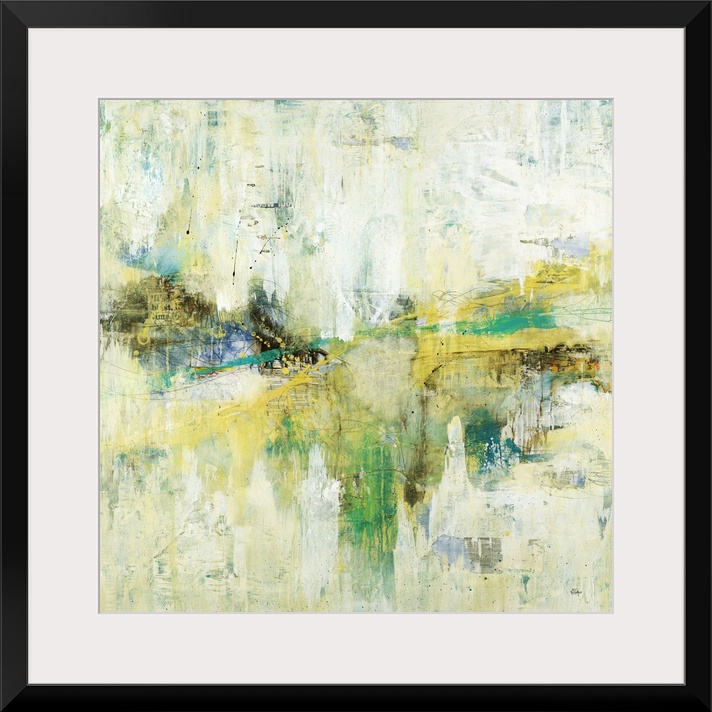 <p>A colorful abstract painting of green, yellow and blue with thin black speckles throughout.</p>