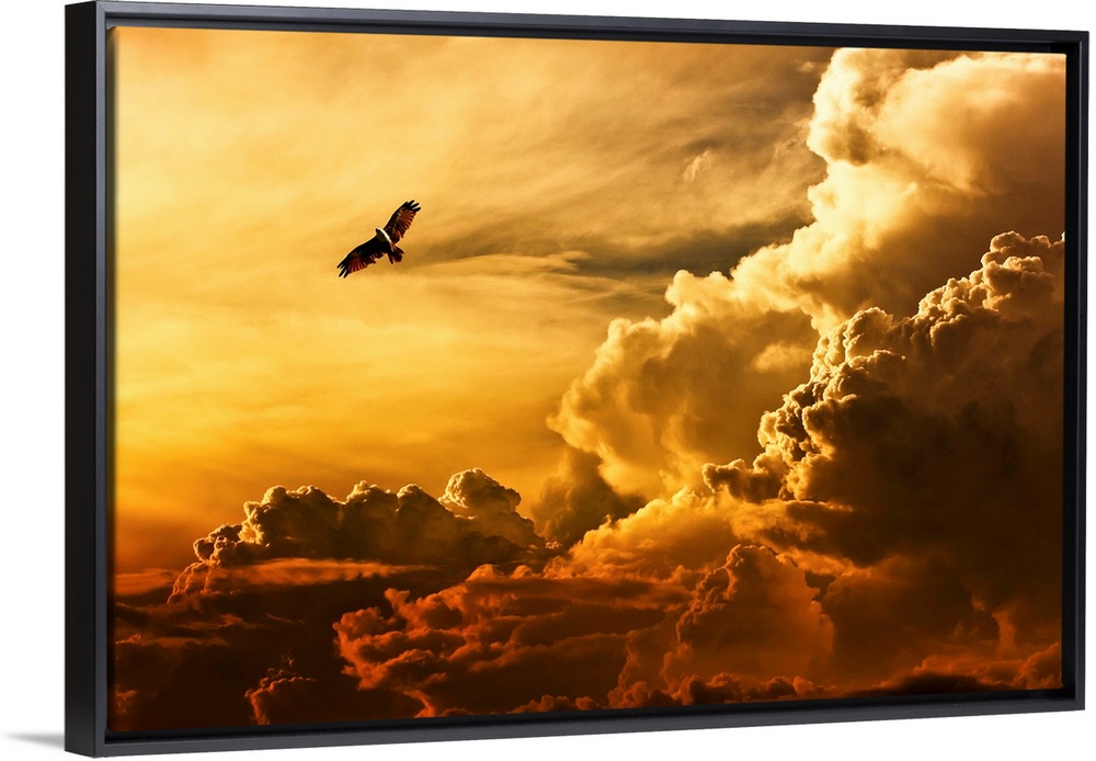 <p>An eagle flying in the sky over large clouds at sunset.</p>
