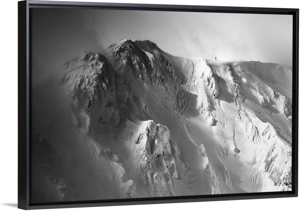 <p>Black and white image of the Tatras Mountains with an immense amount of snow, with a tiny figure visible at the top, Slovakia.</p>