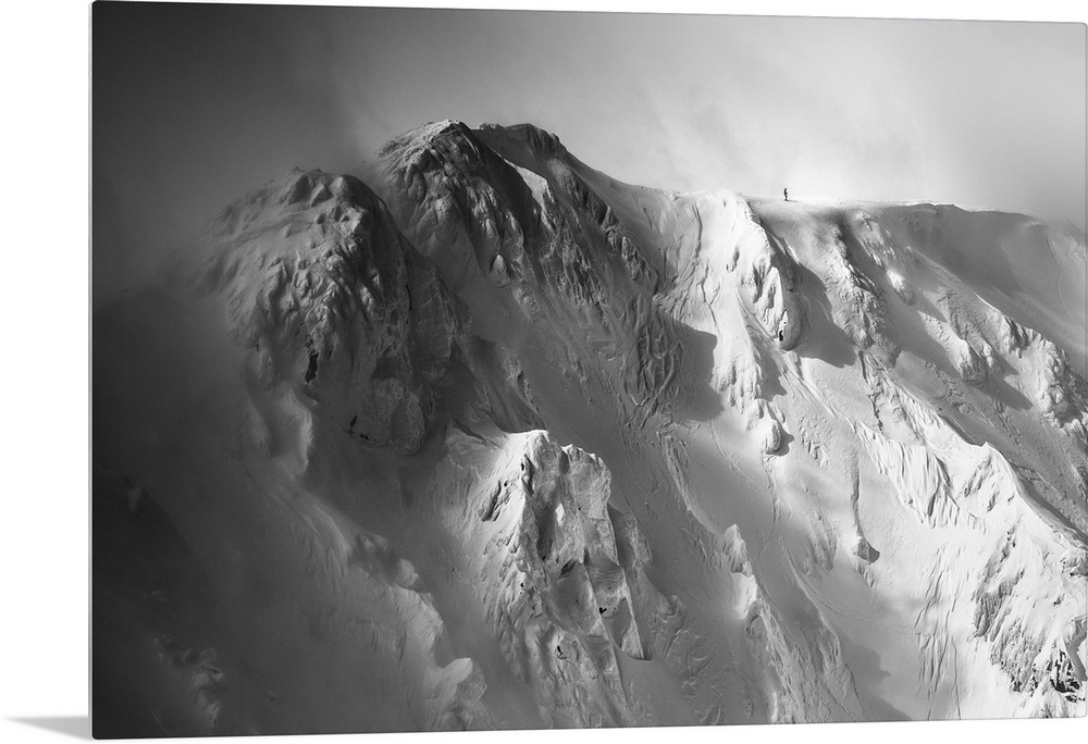 <p>Black and white image of the Tatras Mountains with an immense amount of snow, with a tiny figure visible at the top, Slovakia.</p>
