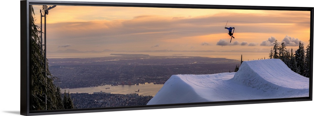 <p>Freestyle skier doing a trick off a jump above city at sunset, Canada</p>