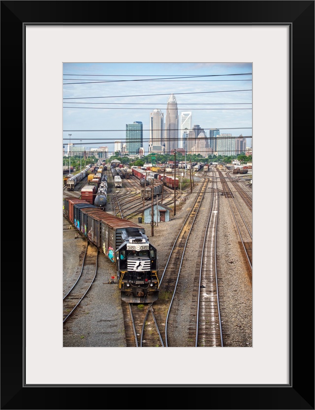 <p>A freight train leaving the city of Charlotte, North Carolina.</p>