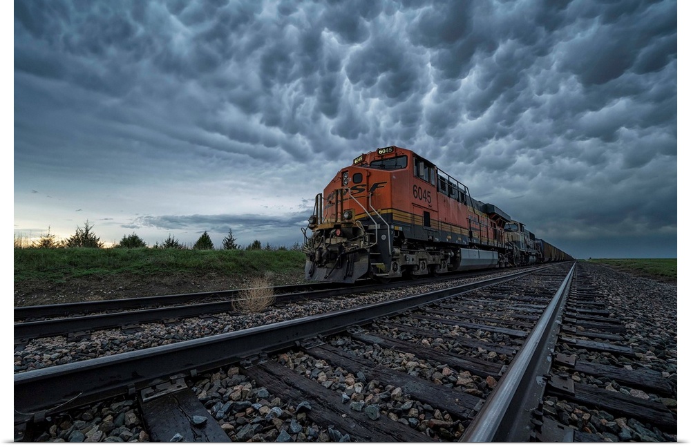<p>Freight train with mammatus clouds overhead while on a storm chasing tour; Oklahoma, United States of America.</p>