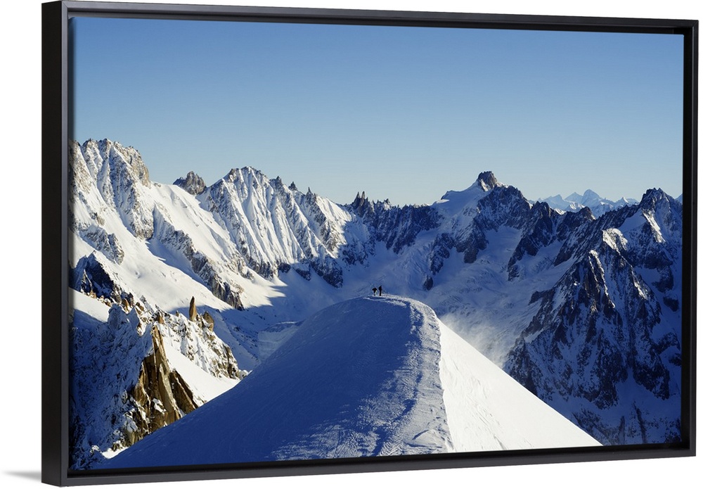<p>Europe, France, French Alps, Haute-Savoie, Chamonix, Aiguille du Midi, skiers walking down the ridge at the start of Vallee Blanche off piste.</p>