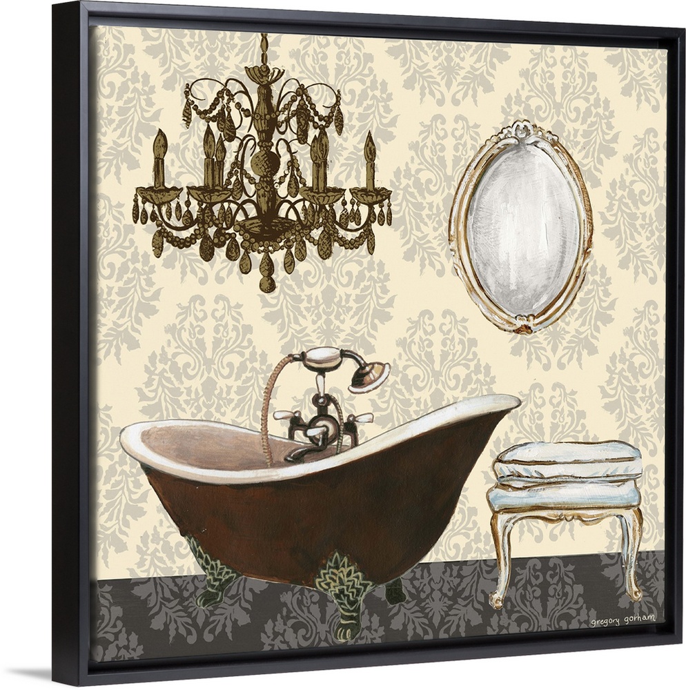 <p>Square painting of an antique clawfoot tub and chandelier on a cream, gray, and black designed background.</p>