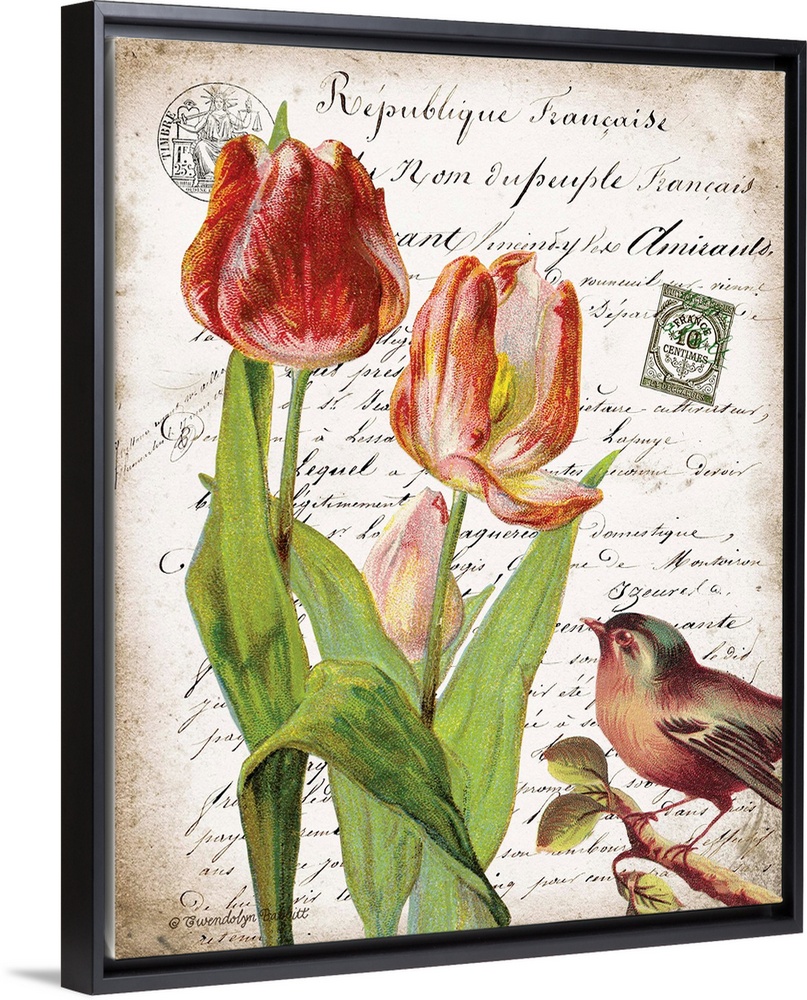 <p>Vintage art with three tulips and a bird on top of an old letter written in French.</p>