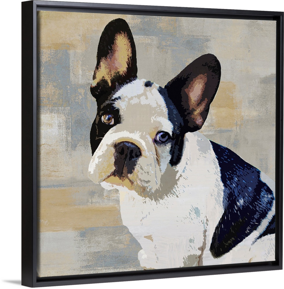 <p>Square decor with a portrait of a French Bulldog on a layered gray, blue, and tan background.</p>