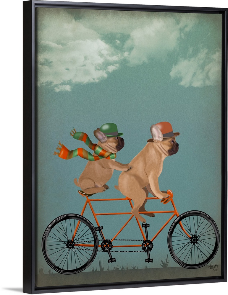 <p>Decorative artwork of two French Bulldogs riding on an orange tandem bicycle and wearing matching accessories.</p>