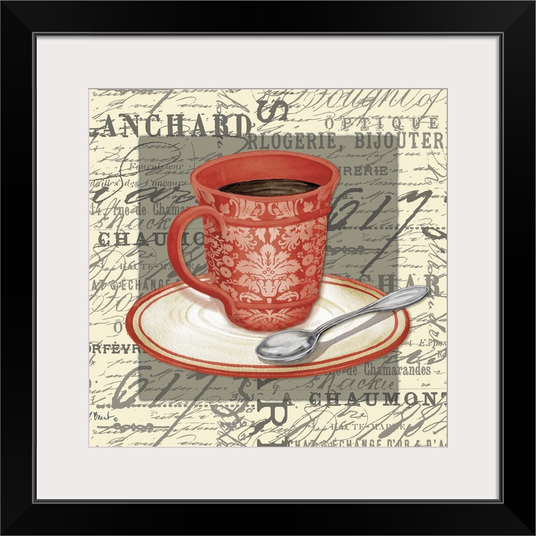 <p>Mixed media panel with a red cup of coffee with a saucer and spoon on vintage text and handwriting.</p>