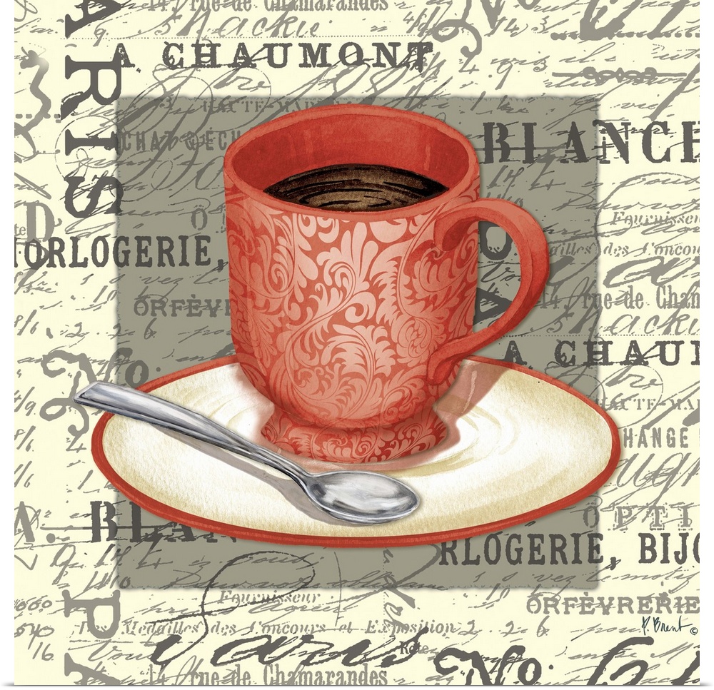 <p>Mixed media panel with a red cup of coffee with a saucer and spoon on vintage text and handwriting.</p>