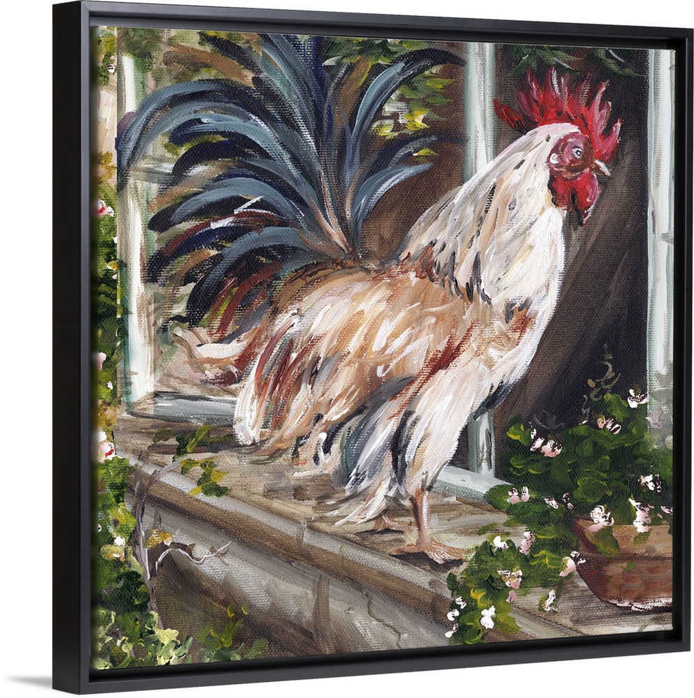 <p>Square contemporary painting in a traditional style of a white and brown rooster perched on a window sill.</p>