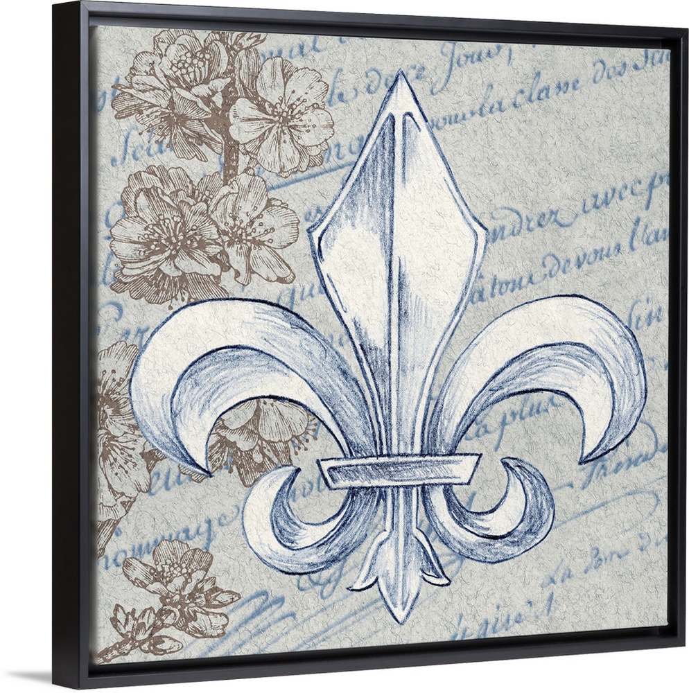<p>Fleur de Lis design over handwritten text, with a vintage floral element.</p>